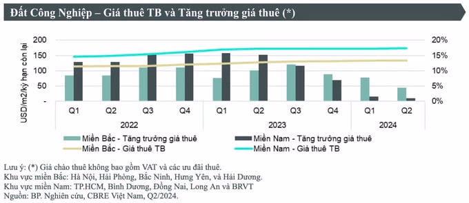 Đối với khu vực phía Nam, giá đất công nghiệp tại các thị trường cấp 1 miền Nam giữ mức 173 USD/m2/kỳ hạn còn lại, ổn định so với quý trước và tăng 1% so với cùng kỳ năm ngoái.