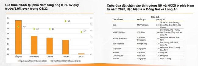 Cũng theo thống kê từ VnDirect, thị trường nhà kho và nhà xưởng xây sẵn đang nổi lên với nguồn cung mới tăng đáng kể, lần lượt tăng 10% so với cùng kỳ lên 3,5 triệu m2 và 8% so với cùng kỳ lên 3,2 triệu m2 trong 2021, theo CBRE. Tỷ lệ lấp đầy nhà xưởng xây sẵn duy trì ở mức cao 89% vào cuối quý I/2022. Giá thuê nhà xưởng xây sẵn tại phía Nam tăng nhẹ 0,9% sv quý trước/5,9% so với cùng kỳ lên 4,8 USD/m2/tháng trong quý I/2022.