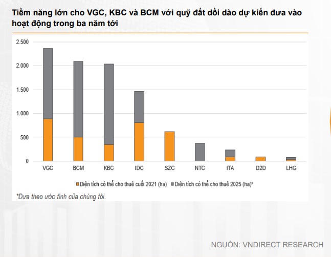 Theo VnDirect, các công ty KCN niêm yết đang tăng tốc mở rộng quỹ đất để đáp ứng nhu cầu thuê đất KCN đang gia tăng mạnh mẽ. Trong đó, sở hữu tiềm năng lớn có thể kể đến như Tổng Công ty Viglacera – CTCP (VGC), Tổng Công ty Phát triển Đô thị Kinh Bắc – CTCP (KBC), Tổng Công ty Đầu tư và Phát triển Công nghiệp – CTCP (BCM) hay Tổng Công ty IDICO – CTCP (IDC). Đây đều là những doanh nghiệp sở hữu quỹ đất dồi dào dự kiến đưa vào hoạt động trong ba năm tới.