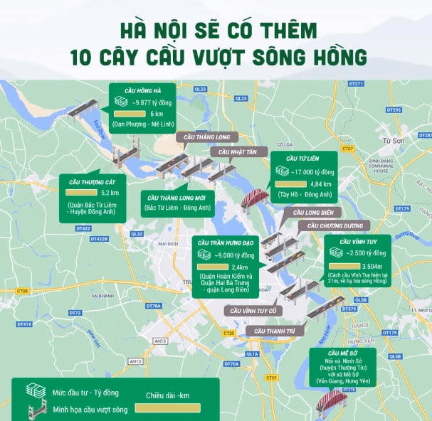 Theo quy hoạch chung của thành phố, Hà Nội sẽ có thêm 10 cây cầu bắc qua sông Hồng, bao gồm: Hồng Hà, Mễ Sở (vành đai 4), Thăng Long mới (vành đai 3), Tứ Liên, Vĩnh Tuy (giai đoạn 2), Thượng Cát, Ngọc Hồi (vành đai 3,5), cầu/hầm Trần Hưng Đạo, cầu Phú Xuyên, Vân Phúc (đường trục Bắc - Nam nối với tỉnh Vĩnh Phúc).