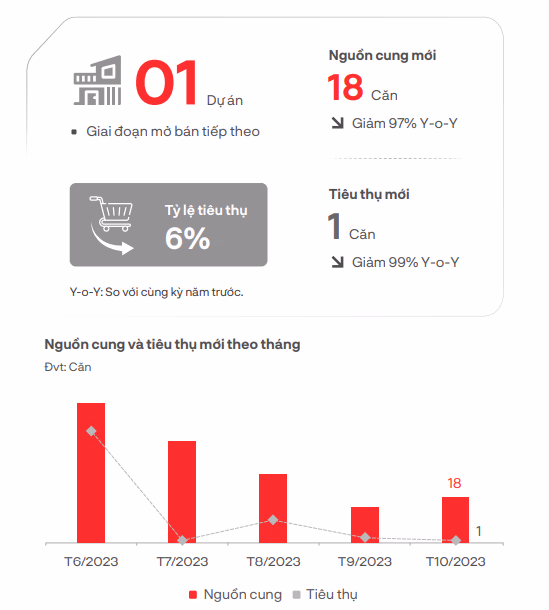 Trong tháng 10, toàn thị trường chỉ có 3 dự án mở bán giai đoạn tiếp theo với tổng quy mô 131 căn. Tỷ lệ này giảm 13% so với tháng trước và giảm 80% so với cùng kỳ năm 2022.