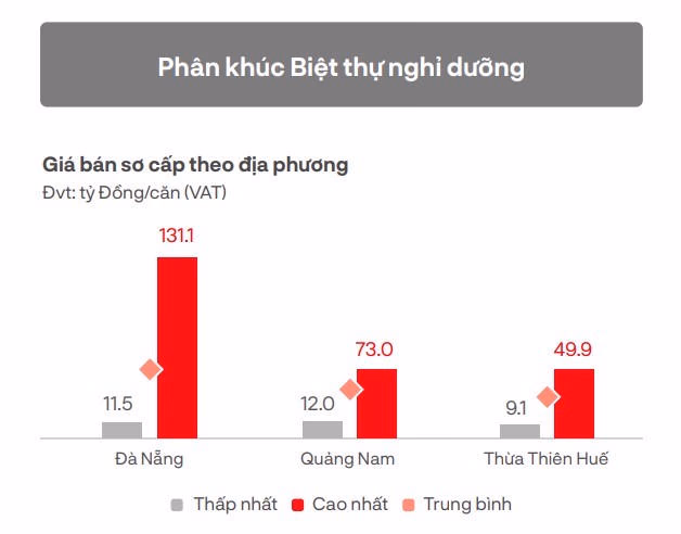 Trong đó, phân khúc biệt thự nghỉ dưỡng rơi vào trạng thái “ngủ đông” khi liên tục không ghi nhận nguồn cung mới trong 9 tháng liên tiếp. Hầu hết nguồn cung đến từ lượng hàng tồn kho của những dự án cũ đã mở bán trước đó. Về giá bán, giá sơ cấp dao động từ 9,1 - 131,1 tỷ đồng/căn (không có nhiều biến động so với cùng kỳ năm trước).