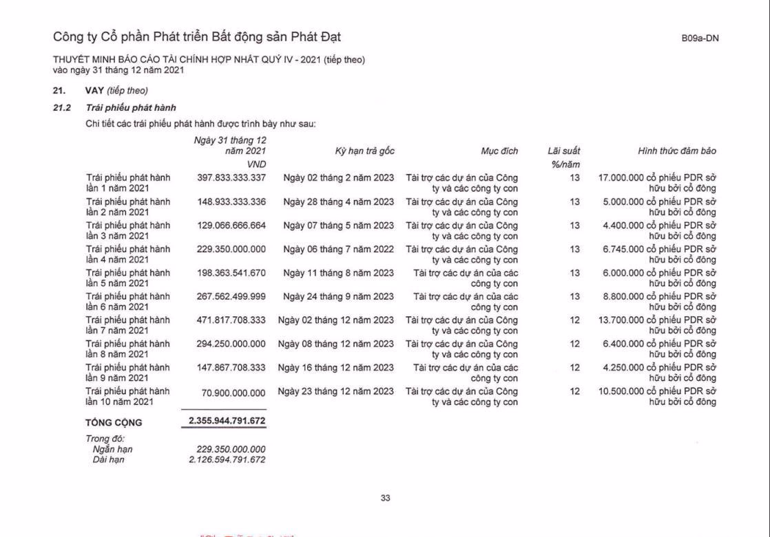 Trước đó, năm 2021 Phát Đạt đã phát hành 10 đợt trái phiếu với tổng giá trị 2.356 tỷ đồng, được đảm bảo bằng 82,79 triệu cổ phiếu PDR. Cả nhà đầu tư tổ chức và cá nhân đều xuất hiện trong các đợt mua. Lãi suất đều ở mức 12 – 13%/năm, mục đích phát hành đều để tài trợ các dự án của Công ty và các công ty con.
