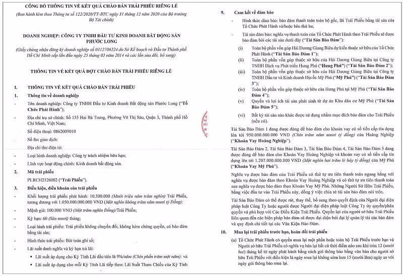 Theo thông tin từ Sở Giao dịch Chứng khoán Hà Nội (HNX) được công bố vào ngày ngày 1/9/2021, Công ty TNHH Đầu tư Kinh danh Bất động sản Phước Long đã phát hành thành công 1.050 tỷ đồng trái phiếu kỳ hạn 60 tháng được phát hành vào ngày 30/6/2021.
