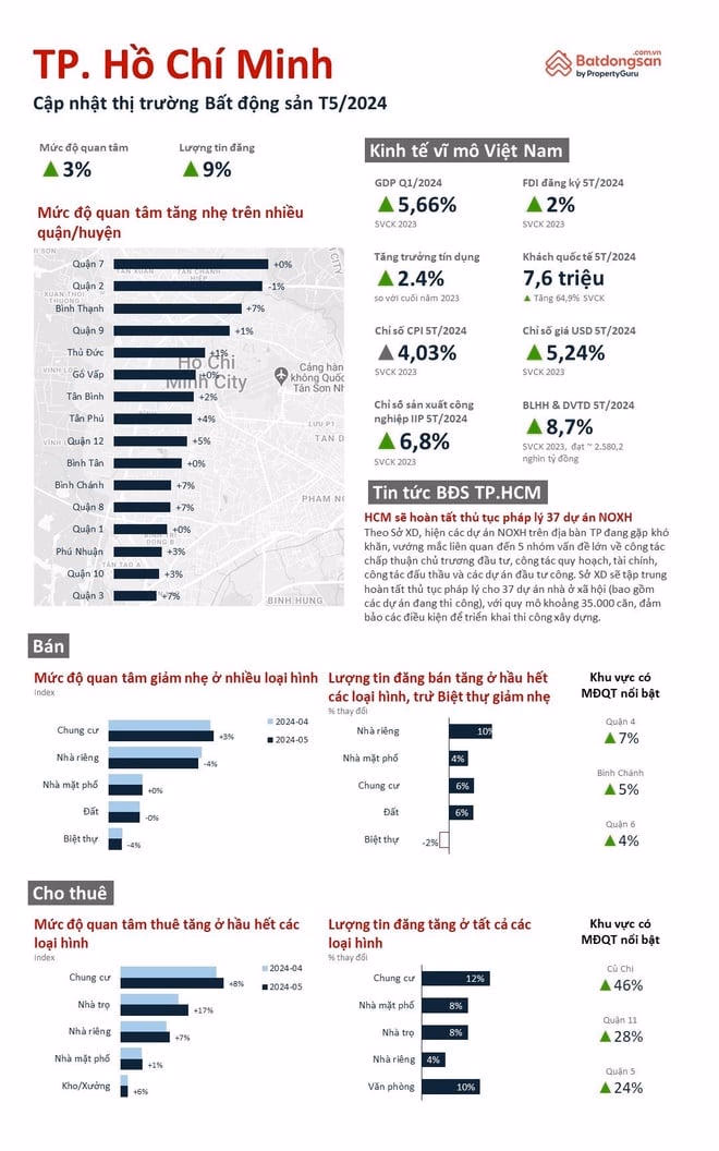 Theo dữ liệu tháng 5/2024 từ Batdongsan.com.vn tháng, mức độ quan tâm bất động sản khu Đông (quận Thủ Đức, quận 9 cũ ) tăng trở lại. Trong đó loại hình chung cư được quan tâm cao hơn các phân khúc khác.