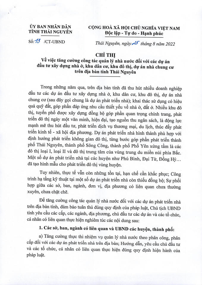 Vừa qua, UBND tỉnh Thái Nguyên ban hành Chỉ thị số 13/CT-UBND về việc tăng cường công tác quản lý nhà nước đối với các dự án đầu tư xây dựng nhà ở, khu dân cư, khu đô thị, dự án nhà chung cư trên địa bàn tỉnh Thái Nguyên.