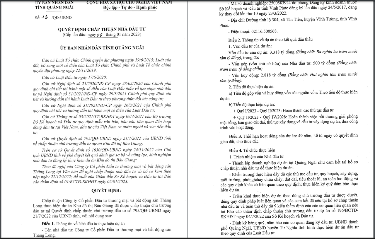 Theo quyết định chấp thuận nhà đầu tư, UBND tỉnh Quảng Ngãi cũng yêu cầu bất động sản Thăng Long phải thành lập doanh nghiệp dự án tại Quảng Ngãi như cam kết tại hồ sơ chấp thuận nhà đầu tư để thực hiện dự án, đồng thời khẩn trương thực hiện đầy đủ các thủ tục đầu tư, quy hoạch, xây dựng, môi trường và các quy định khác có liên quan theo quy định; thực hiện ký quỹ đảm bảo thực hiện dự án.