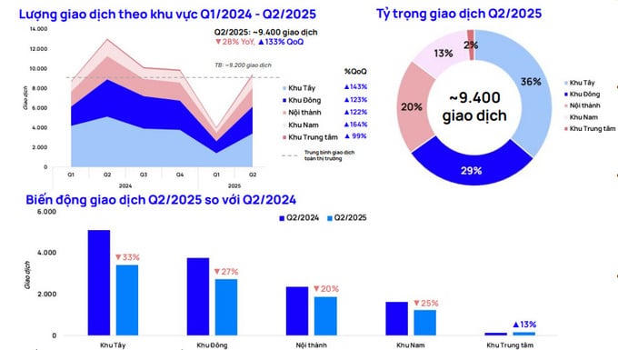 Diễn biến thị trường không đồng đều tại các khu vực, với hai "cực" tăng trưởng chính là khu Tây và khu Đông, trong khi khu trung tâm duy trì sự ổn định. Khu Tây tiếp tục khẳng định vị thế dẫn đầu với 3.600 giao dịch, chiếm tới 36% thị phần. Nhu cầu mua nhà tại đây luôn duy trì ở mức cao nhờ mật độ dân cư đông đúc, hạ tầng giao thông và xã hội đồng bộ, cùng với lợi thế gần các khu văn phòng lớn.