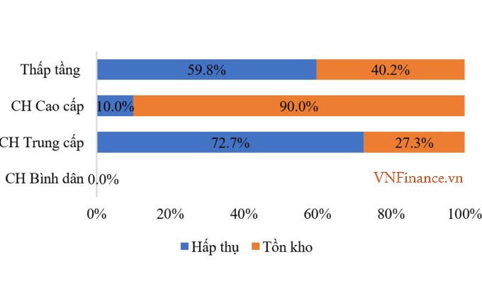 Tại Hà Nội, Báo cáo của VARs cho thấy, trong quý 2/2021, Hà Nội có 3.726 căn hộ mở bán, nhưng chỉ có 670 giao dịch phát sinh, tỷ lệ giao dịch chỉ đạt 18%. Tất cả các phân khúc đều có tỷ lệ tồn kho rất lớn. Trong đó, căn hộ hạng A tồn tới 90,8% tổng lượng cung, căn hộ trung cấp tồn 79,9% và căn căn hộ bình dân tồn 68,3%.