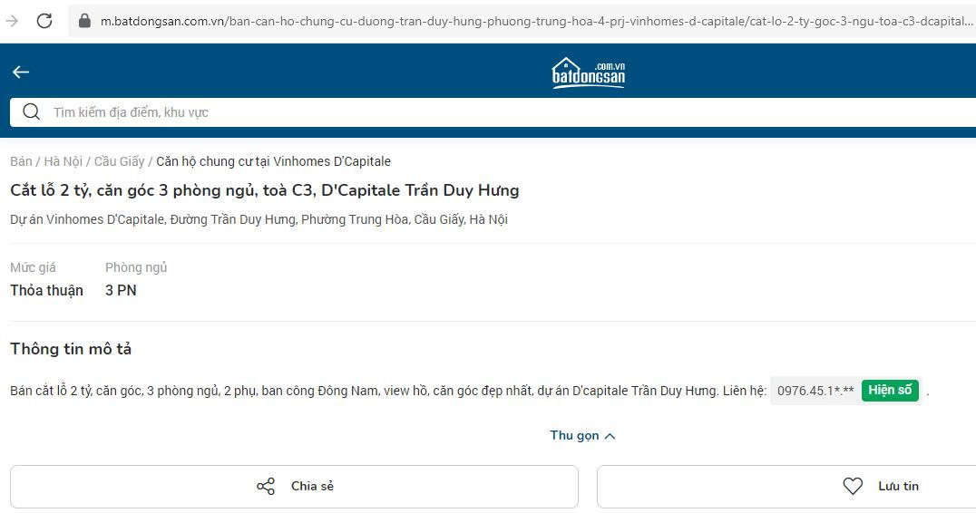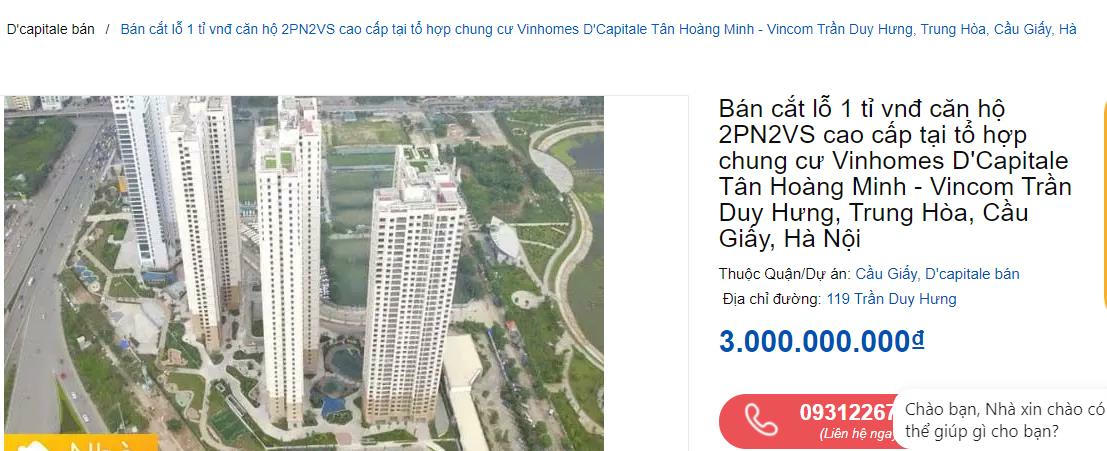 Cụ thể tại dự án D'Capitale Trần Duy Hưng, một căn hộ có 3 phòng ngủ, 2 phòng vệ sinh, ban công hướng Đông Nam, view hồ, được giới thiệu là căn góc đẹp nhất nhưng đang được rao bán cắt lỗ lên đến 2 tỷ đồng.
