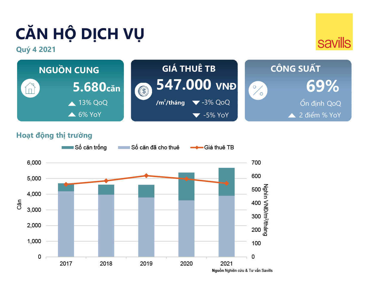 Giá thuê trung bình năm 2021 giảm -9% theo năm, xuống mức 1.680.000 đồng/phòng/đêm, dẫn đầu bởi phân khúc khách sạn 5 sao với nguồn cầu ổn định từ khách doanh nhân và khách ở dài hạn.