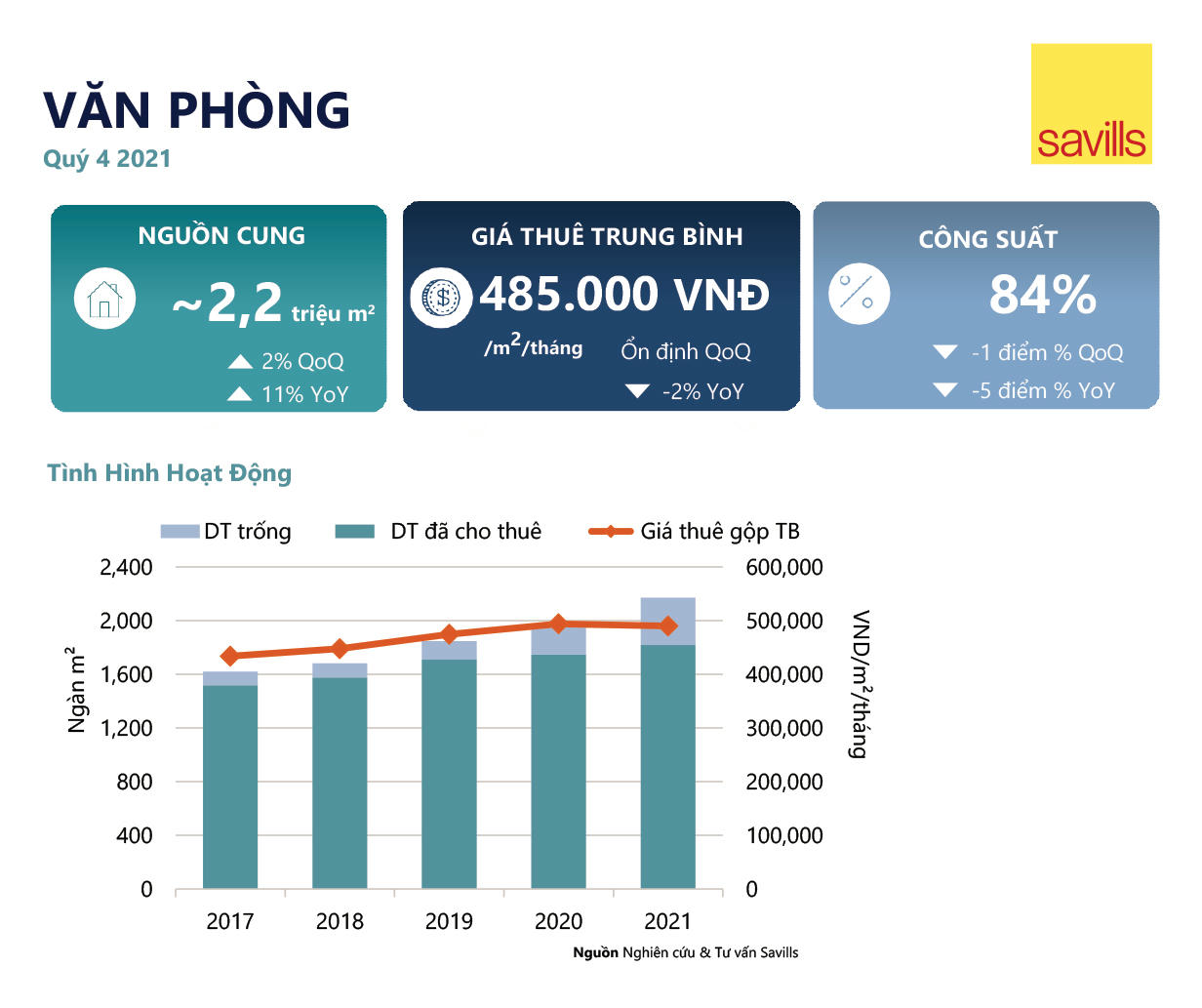 Xét theo tỷ lệ lấp đầy, văn phòng hạng C đang chiếm ưu thế với 90%. Nhìn chung toàn thị trường, công suất giảm -1% theo quý xuống 84%, tương đương mức giảm -5% theo năm.