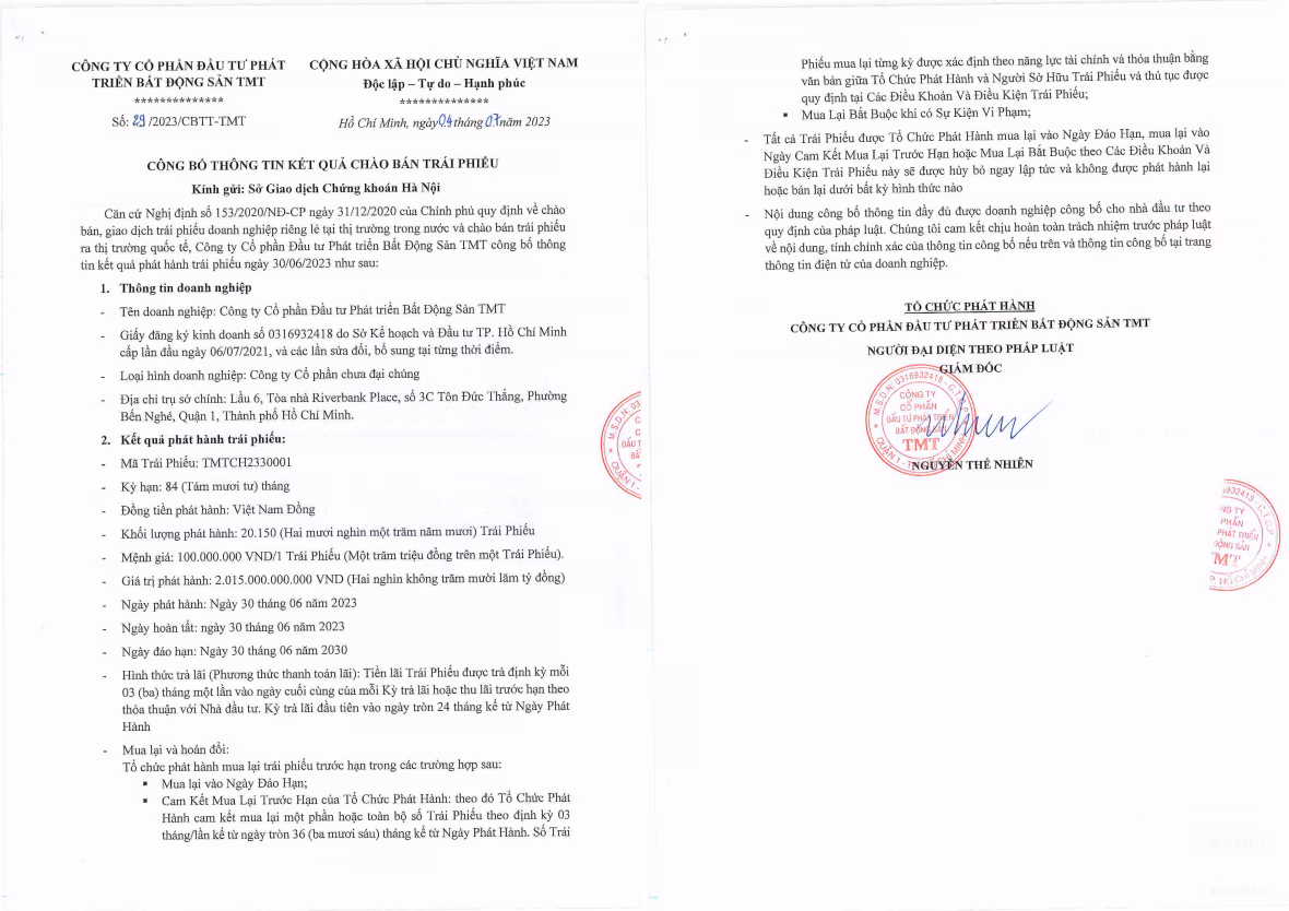 Ngày 4/7/2023, Công ty CP Đầu tư Bất động sản TMT (Bất động sản TMT) đã có văn bản số 29/2023/CBTT-TMT gửi Sở Giao dịch Chứng khoán Hà Nội (HNX) công bố kết quả chào bán trái phiếu.