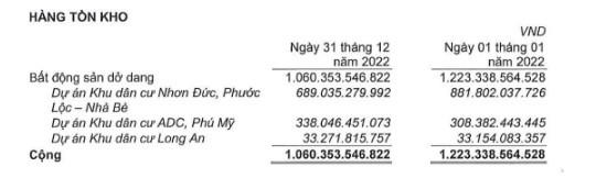 Hàng tồn kho của công ty chủ yếu nằm ở bất động sản dở dang tại 3 dự án là Khu dân cư Nhơn Đức, Phước Lộc- Nhà Bè (689 tỷ đồng); Dự án Khu dân cư ADC, Phú Mỹ (338 tỷ đồng) và một phần nhỏ trong Dự án Khu dân cư Long An (33 tỷ đồng). Nhìn vào lịch sử hàng tồn kho của công ty, thời điểm đầu năm 2022 đến cuối năm 2022, hàng tồn kho có giảm, nhưng vẫn nằm ở 3 dự án nêu trên.