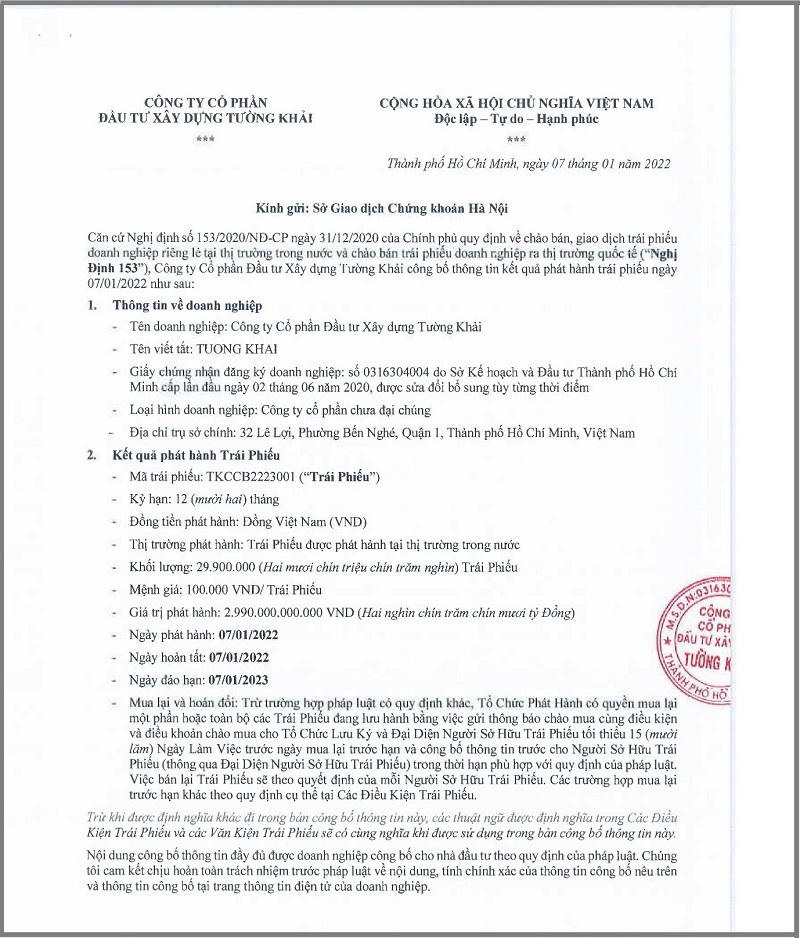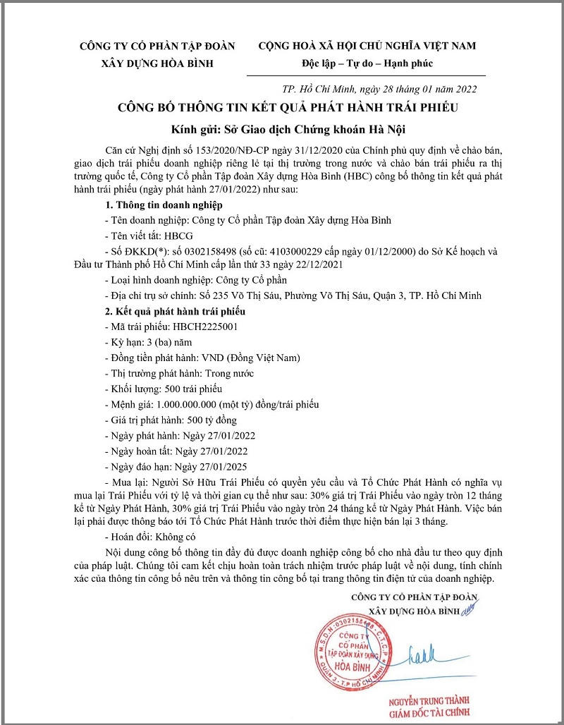 Cụ thể, lô trái phiếu được Xây dựng Hòa Bình phát hành có mã HBCH2225001, có kỳ hạn 3 năm, phát hành và hoàn tất vào ngày 27/1/2022, đáo hạn vào ngày 27/1/2025.
