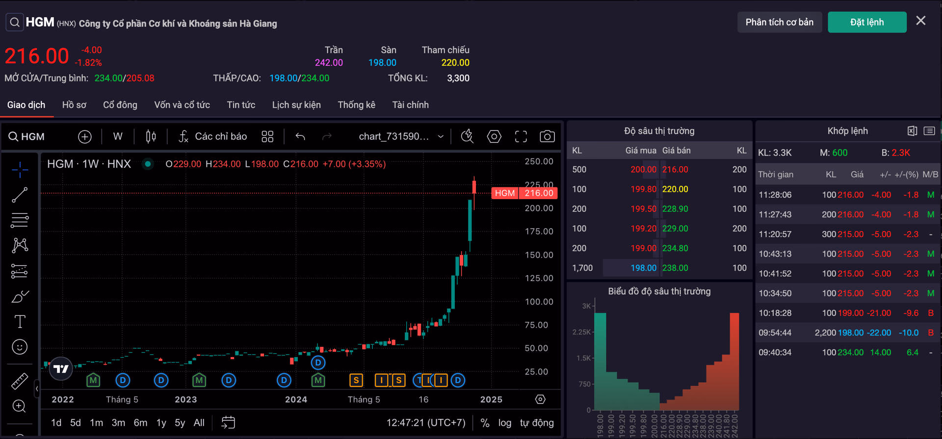 Không lâu sau đó, lực mua xuất hiện đã giúp cổ phiếu HGM "thoát sàn". Kết phiên sáng, mã này đóng cửa ở mức 216.000 đồng/cp, mất 1,82% thị giá.