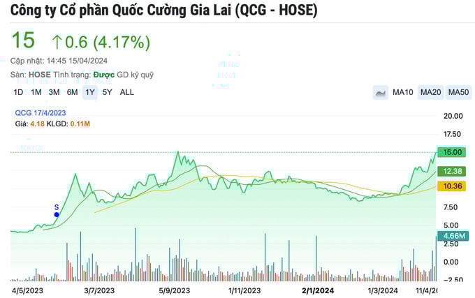 Đáng chú ý, trong bối cảnh thị trường đỏ lửa, cổ phiếu QCG của Quốc Cường Gia Lai lại ngược dòng tăng 4,17% lên 15.000 đồng/cổ phiếu, áp sát vùng đỉnh của gần 1 năm.