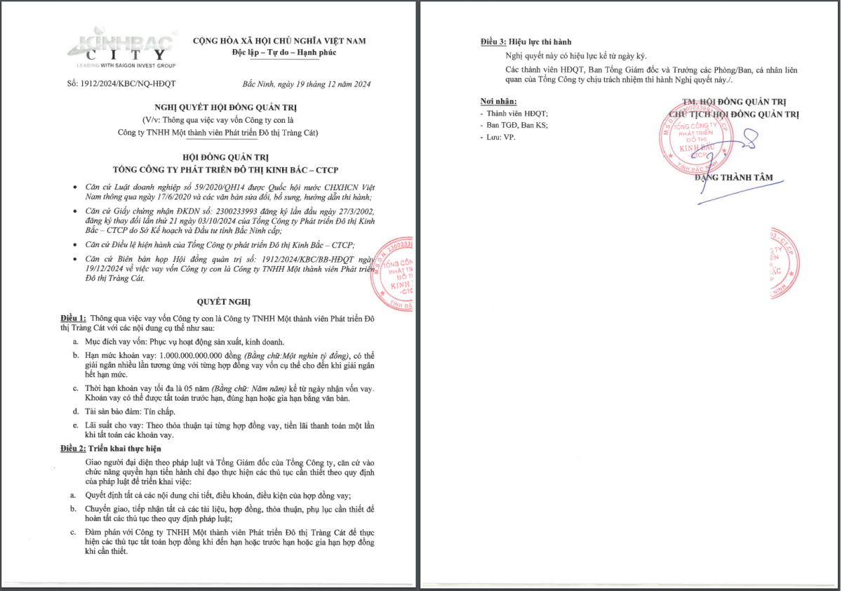 Nhằm bổ sung thêm dòng tiền, vào cuối năm 2024, Kinh Bắc đã thông qua việc vay tín chấp 1.000 tỷ đồng từ công ty con là Công ty TNHH Một thành viên Phát triển Đô thị Tràng Cát (TCC).