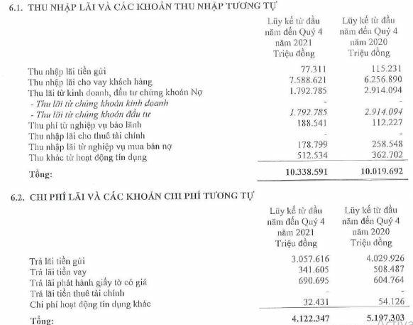 Theo báo cáo kết quả hoạt động kinh doanh, thu nhập lãi thuần của MSB năm 2021 tăng 29% thu về hơn 6.216 tỷ đồng. Nếu nguồn thu này đến từ việc mở rộng cho vay các khách hàng, nó sẽ cho thấy khả năng tăng tín dụng của MSB hiệu quả. Song khi nhìn vào báo cáo tài chính của MSB có thể thấy, thu nhập từ lãi vay và các khoản thu nhập tương tự dường như không tăng nhiều so với năm ngoái, ghi nhận 10.338 tỷ đồng trong khi cùng kỳ 2020 đạt 10.019 tỷ đồng, tương đương chỉ tăng nhẹ 3%.