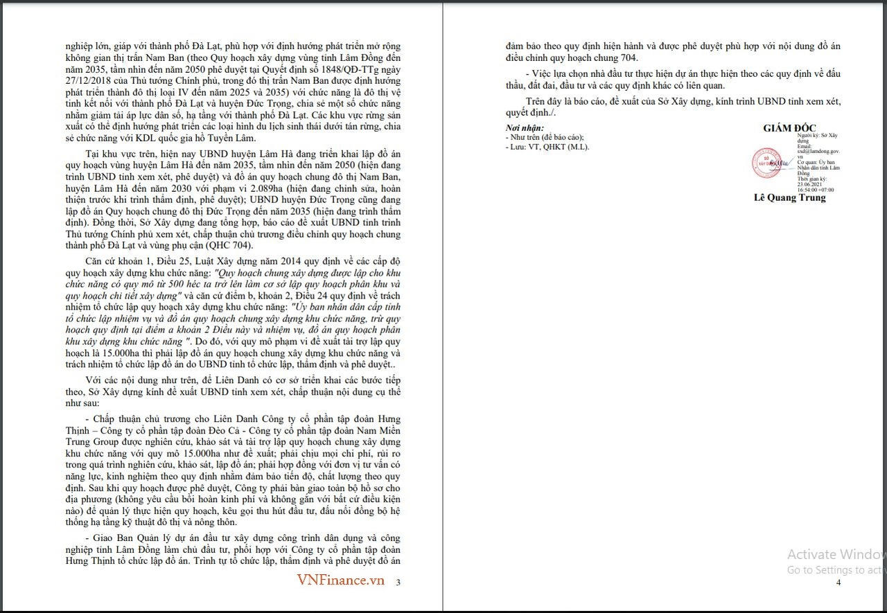Vì vậy, Sở Xây dựng tỉnh Lâm Đồng đề xuất UBND tỉnh này xem xét, chấp thuận chủ trương cho Liên danh Hưng Thịnh – Đèo Cả - Nam Miền Trung được nghiên cứu, khảo sát và tài trợ lập quy hoạch chung xây dựng khu chức năng với quy mô 15.000 ha như đề xuất.