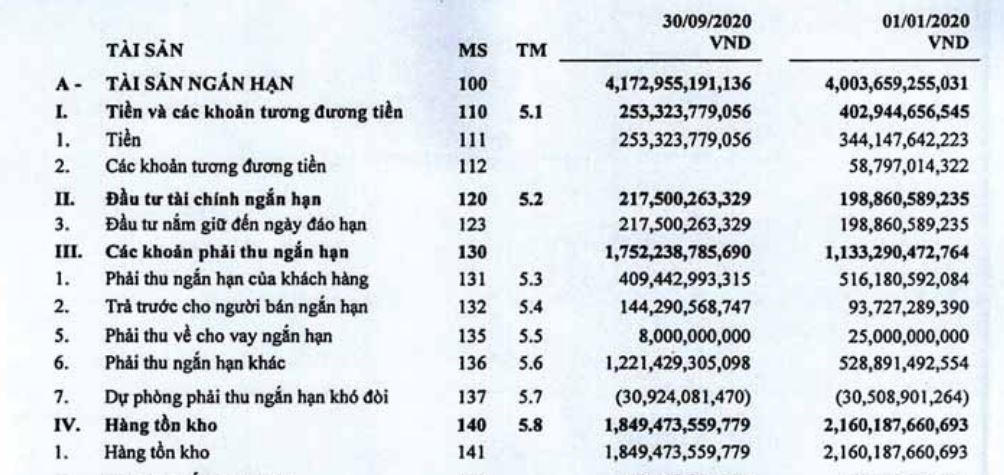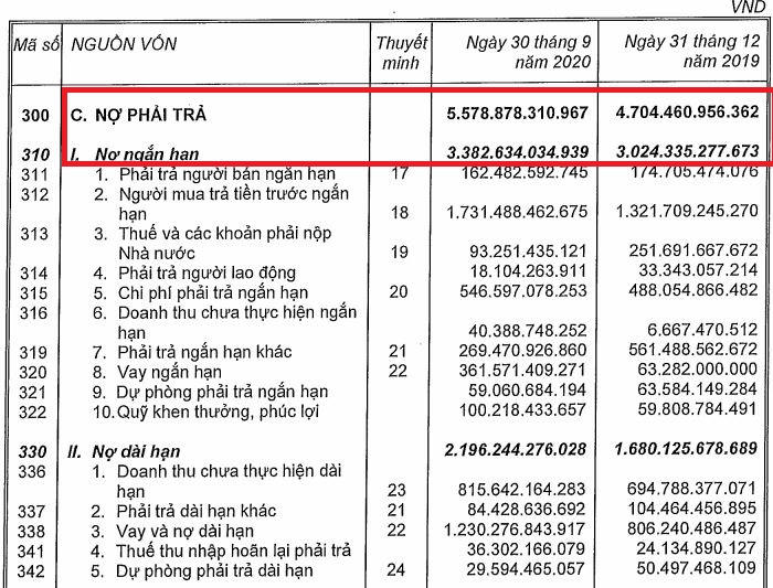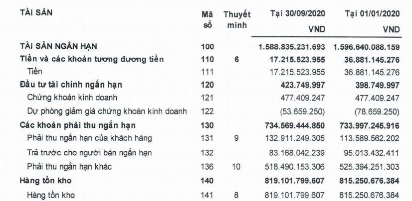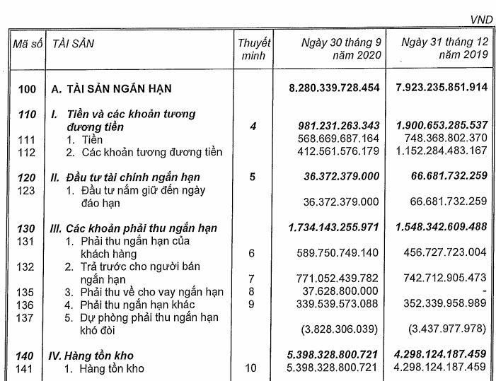 Ghi nhận báo cáo tài chính hợp nhất quý 3/2020, trong khi các khoản phải thu ngắn hạn của công ty này tăng 12% so với đầu năm, lên hơn 1.734 tỷ đồng thì hàng tồn kho thậm chí còn tăng 26%, lên mức hơn 5.398 tỷ đồng. Cùng với hàng tồn kho và khoản phải thu tăng lên, nợ phải trả của Công ty cũng tăng 19%, đạt gần 5.579 tỷ đồng, trong đó khoản phải trả ngắn hạn tăng lên gần 3.383 tỷ đồng.