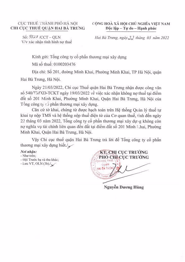 Trong công văn nêu rõ: “Căn cứ tờ khai, chứng từ được hạch toán trên Hệ thống Quản lý thuế tự khai tự nộp TMS và hệ thống nộp thuế điện tử của Cơ quan thuế, tính đến ngày 22 tháng 03 năm 2022, Tổng công ty cổ phần thương mại xây dựng không còn nợ nghĩa vụ tài chính liên quan đến đất tại điểm đất số 201 Minh Khai, phường Minh Khai, quận Hai Bà Trưng, Hà Nội”.