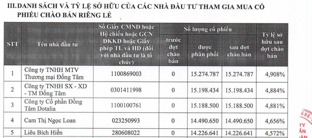 Trong đó, đáng chú ý có Công ty TNHH MTV Thương mại Đồng Tâm (nắm 4,9% cổ phần); Công ty TNHH SX – XD – TM Đồng Tâm (năm 4,88% cổ phần) và CTCP Đồng Tâm Dotalia (năm 4,88% cổ phần). Ba tổ chức này đều thuộc Đồng Tâm Group (doanh nghiệp của ông bầu Võ Quốc Thắng - “bầu Thắng).