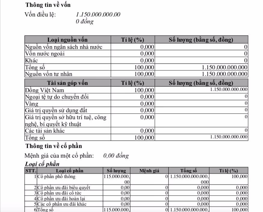 Tiếp đó, tại ngày cấp đăng ký thay đổi ngày 5/12/2022, công ty lại nâng vốn điều lệ lên 900 tỷ đồng. Đến ngày 7/7/2023, công ty lại nâng vốn điều lệ lên 1.150 tỷ đồng. Cổ đông không được đề cập. Vốn điều lệ của công ty được tăng lên 1.349 tỷ đồng vào tháng 8/2024.