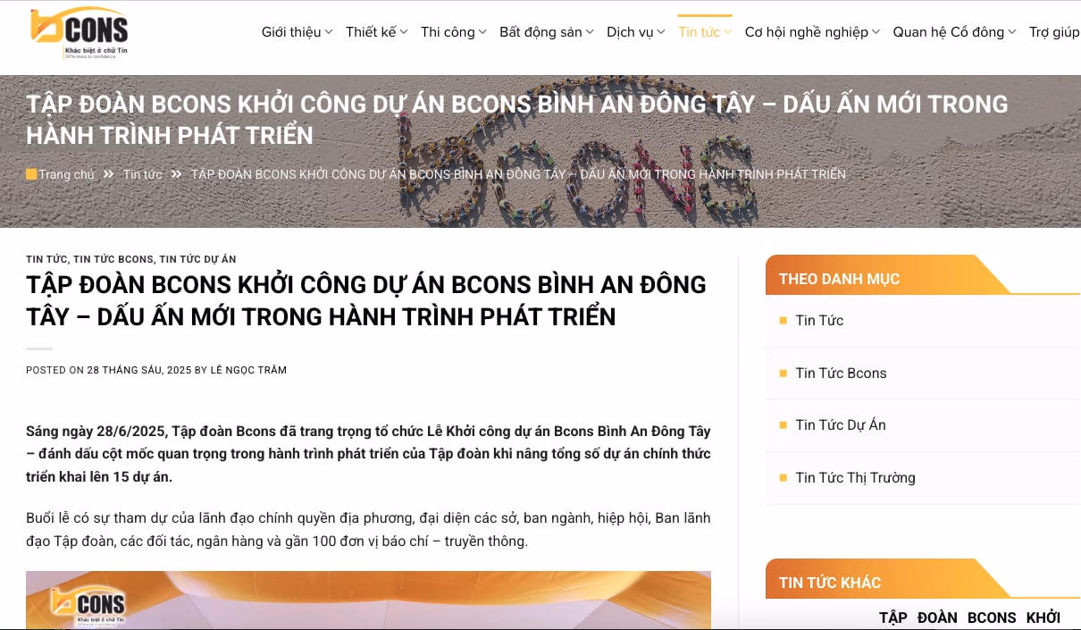 Vừa qua, Tập đoàn BCONS chính thức tổ chức lễ khởi công dự án Bcons Bình An – Đông Tây, tại thành phố Dĩ An, tỉnh Bình Dương. Dự án tọa lạc trên khu đất rộng 30.000m2, tổng mức đầu tư hơn 6.500 tỷ đồng.