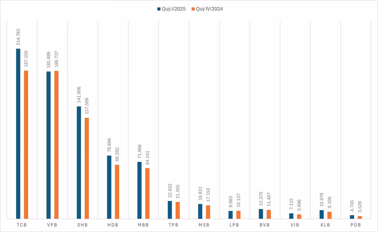 Cụ thể, trong số 3 ngân hàng quốc doanh niêm yết, khoản mục này trong quý I/2025 đã tăng 51% so với cùng kỳ và tăng 2 điểm cơ bản so với cùng kỳ khi tính theo tỷ lệ trên dư nợ cho vay.