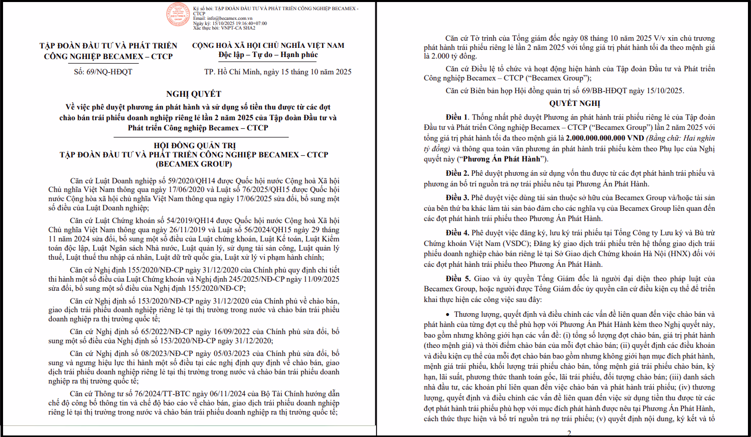 Nên nhớ, trước đó, vào ngày 29/8/2025, Becamex Group cũng đã đã phát hành thành công 20.000 trái phiếu mã BCM12502, huy động thành công 2.000 tỷ đồng. Ngày 6/8, Becamex IDC cũng phát hành thành công 5.000 trái phiếu mã BCMH12501 với mệnh giá 100 triệu đồng/trái phiếu, huy động về 500 tỷ đồng.