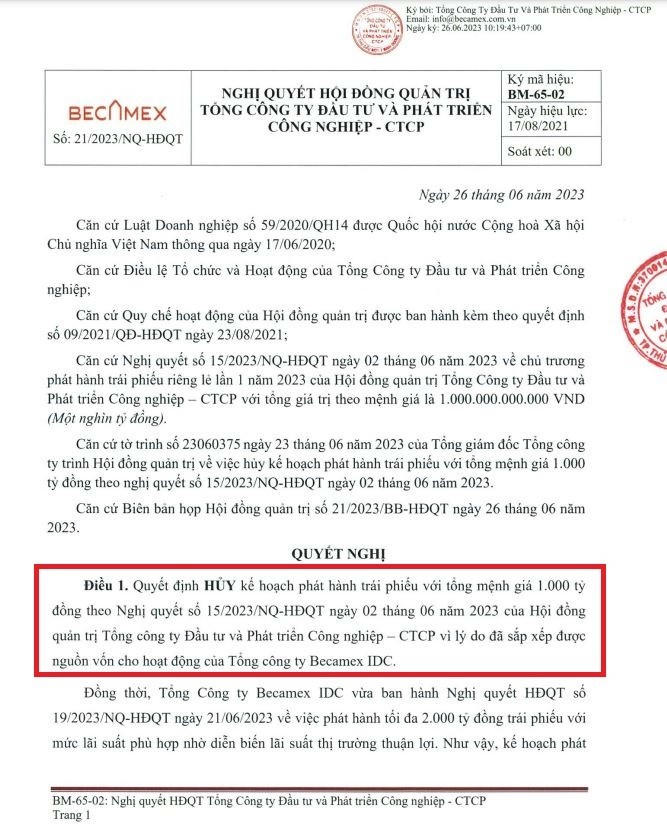 Cụ thể, ngày 26/6/2023, Becamex IDC đã công bố Nghị quyết về việc hủy kế hoạch phát hành trái phiếu với tổng mệnh giá 1.000 tỷ đồng theo Ngị quyết số 15/2023/NQ-HĐQT ngày 2/6/2023.