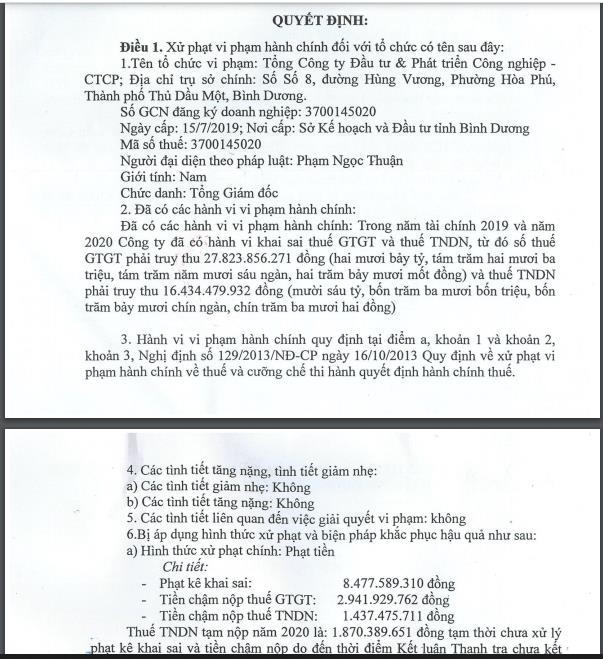 Theo đó, Cục Thuế tỉnh Bình Dương đã có quyết định xử phạt hành chính đối với Becamex IDC số tiền 12,8 tỷ đồng. Nguyên nhân là do Becamex IDC đã có hành vi khai sai thuế giá trị gia tăng và thuế thu nhập doanh nghiệp trong năm tài chính 2019 và 2020.
