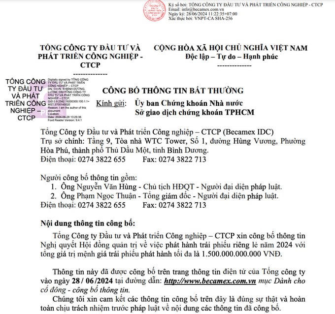 Tổng Công ty Đầu tư và Phát triển Công nghiệp – CTCP (Becamex IDC; mã chứng khoán: BCM) đã ban hành Nghị quyết về việc phê duyệt phương án phát hành trái phiếu riêng lẻ với tổng giá trị phát hành tối đa theo mệnh giá là 1.500 tỷ đồng.