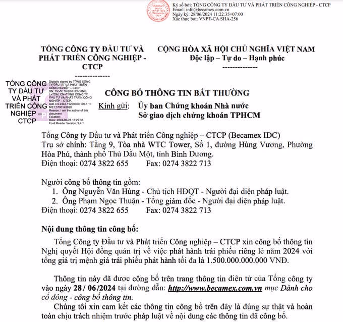 Hội đồng quản trị Becamex IDC đã phê duyệt phương án phát hành trái phiếu riêng lẻ với tổng giá trị phát hành tối đa theo mệnh giá là 1.500 tỷ đồng.