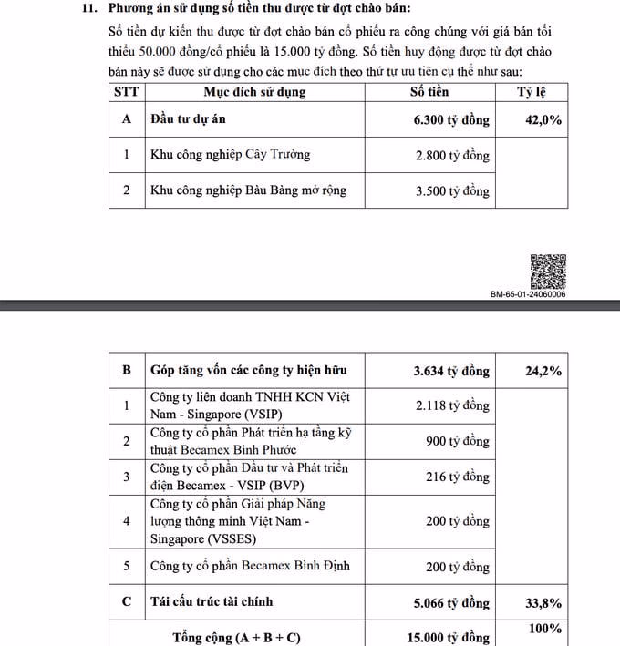 Giá khởi điểm đấu sẽ không thấp hơn 50.000 đồng/cổ phiếu. Với số tiền dự kiến huy động tối thiểu là 15.000 tỷ đồng, Becamex IDC sẽ đầu tư 6.300 tỷ đồng vào các dự án; 3.634 tỷ đồng góp vốn vào các thành viên hiện hữu và 5.066 tỷ đồng tái cấu trúc tài chính. Danh sách hạng mục dự kiến được giải ngân vốn gồm: KCN Bàu Bàng mở rộng 3.500 tỷ đồng, KCN Cây Trường 2.800 tỷ đồng, VSIP 2.118 tỷ đồng, Becamex Bình Phước 900 tỷ đồng...