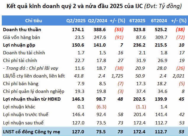 Cụ thể, trong quý II/2025, Becamex IJC ghi nhận doanh thu thuần hơn 174 tỷ đồng, giảm 55% so với cùng kỳ năm trước. Nguyên nhân chủ yếu đến từ sự suy giảm sâu của mảng kinh doanh bất động sản - từng là trụ cột đóng góp lớn cho doanh thu chỉ mang về gần 36 tỷ đồng, tương ứng mức giảm tới 85%.