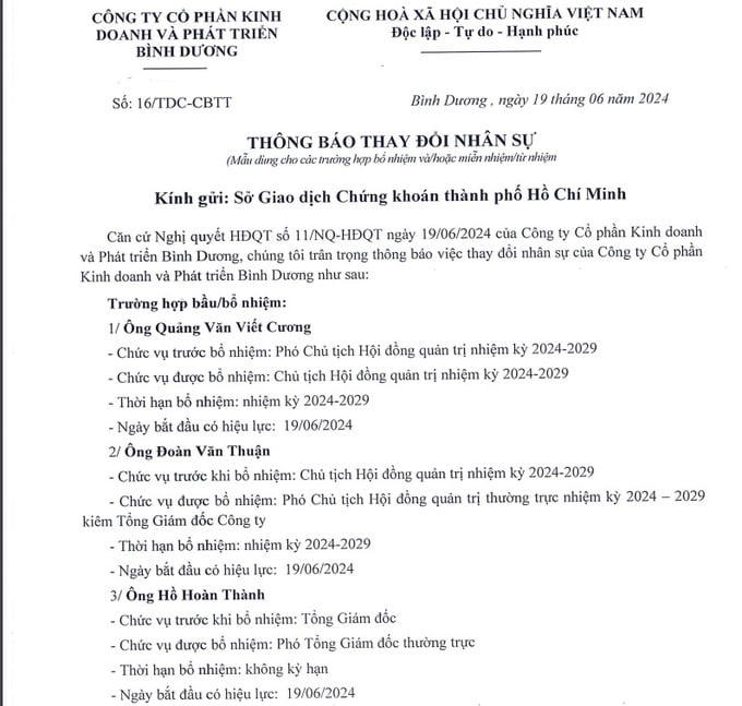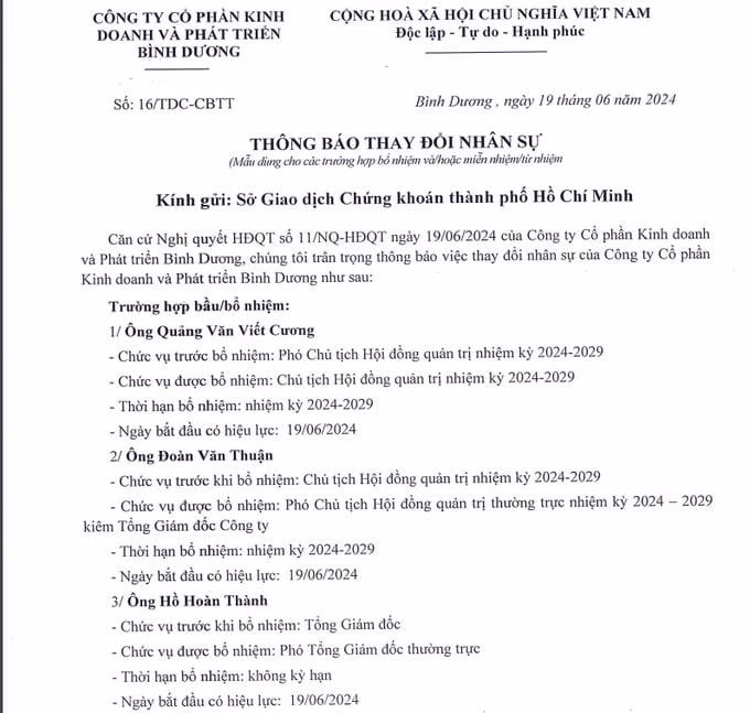 Công ty Cổ phần Kinh doanh và Phát triển Bình Dương (mã chứng khoán: TDC) (gọi tắt là Becamex TDC) đã công bố Nghị quyết quản trị về việc nhân sự cao cấp của công ty này, cụ thể, Hội đồng quản trị Becamex TDC miễn nhiệm chức Chủ tịch Hội đồng quản trị ông Đoàn Văn Thuận, xuống giữ chức vụ Phó Chủ tịch Hội đồng quản trị thường trực nhiệm kỳ 2024-2029 kiêm Tổng Giám đốc Công ty Becamex TDC bắt đầu từ ngày 19/6.