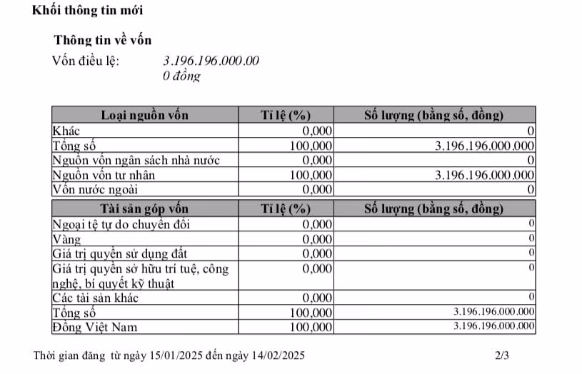 Đến cuối năm 2024 (tháng 12/2024), công ty lại nâng vốn điều lệ lên gần 1.936,2 tỷ đồng. Cập nhật thay đổi gần nhất ngày 14/1/2025, vốn điều lệ của công ty là gần 3.196,2 tỷ đồng.