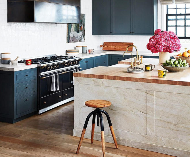 Nhà bếp trang nhã với nội thất làm từ gỗ và đá cẩm thạch, mang nhiều gam màu ấm, được kết hợp hài hòa. Các khung cửa sổ mang đến cảnh sắc sân vườn cùng sự thoáng mát, cởi mở cho không gian. |
