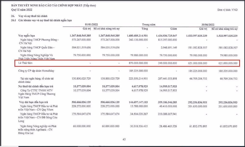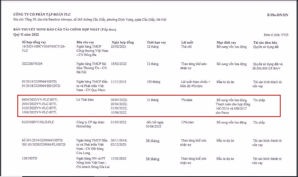 Tại thuyết minh trong báo cáo tài chính của FLC, ngoài khoản nợ từ các Ngân hàng quen thuộc như Sacombank, BIDV, OCB, NCB, Agribank và Công ty Chứng khoán MBS với số dư cho vay từ hàng trăm tỷ đồng lên đến hàng ngàn tỷ đồng, thì còn có một chủ nợ cá nhân khác với khoản vay 870 tỷ đồng đó là ông Lê Thái Sâm - thành viên Hội đồng quản trị (HĐQT) mới được bầu tại đại hội cổ đông bất thường ngày 2/7/2022.