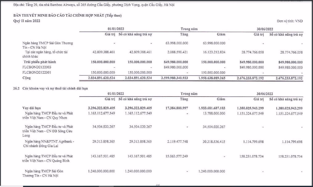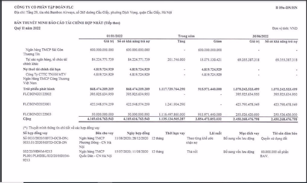 FLC cũng cho biết, Trong kỳ, công ty đã trả bớt 249 tỷ đồng, dư nợ còn lại của khoản vay này là là 621 tỷ đồng, tính vào ngày 30/6/2022.