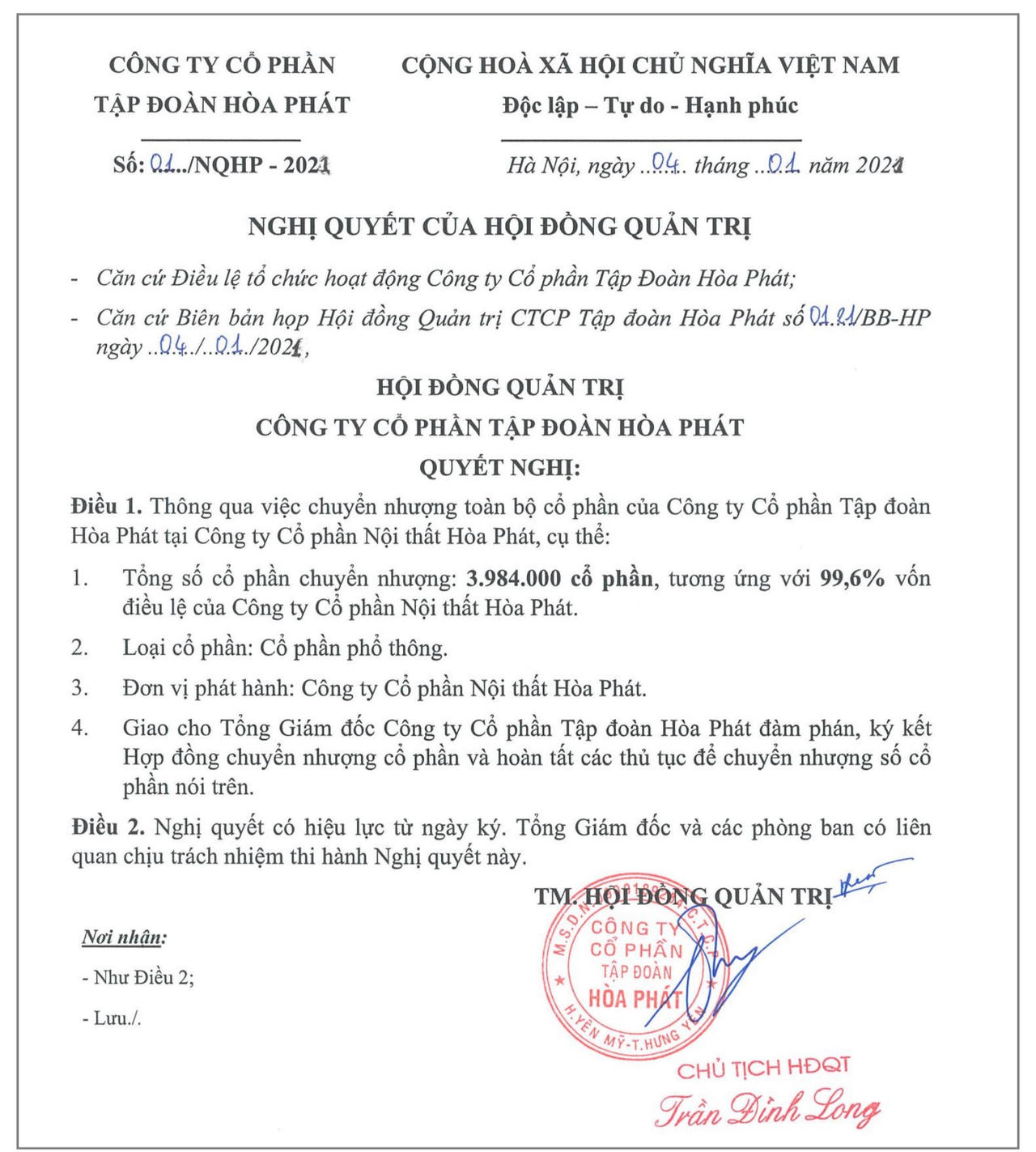 Được biết, trước đó ngày 4/1/2021 HĐQT Công ty Cổ phần Tập đoàn Hòa Phát cũng đã thông qua nghị quyết về việc chuyển nhượng toàn bộ cổ phần của Tập đoàn tại Công ty Cổ phần Nội thất Hòa Phát. Theo đó, giao Tổng giám đốc Công ty Cổ phần Tập đoàn Hòa Phát đàm phán, ký kết Hợp đồng chuyển nhượng cổ phần và hoàn tất các thủ tục chuyển nhượng.