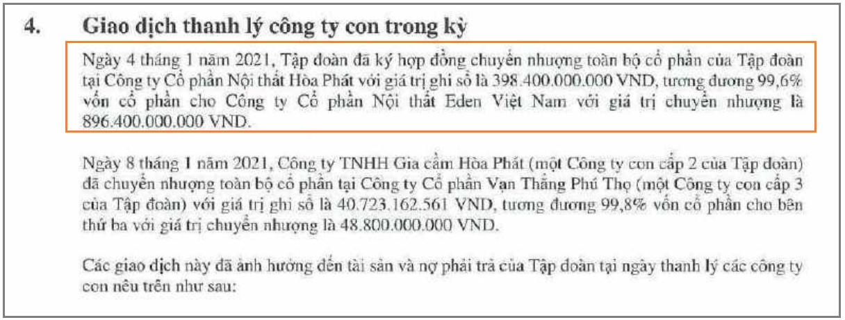 Theo Báo cáo tài chính bán niên soát xét năm 2021 của Tập đoàn Hòa Phát, doanh nghiệp đã ký hợp đồng chuyển nhượng toàn bộ cổ phần Tập đoàn tại Công ty Cổ phần Nội thất Hòa Phát cho Công ty Cổ phần Nội thất Eden Việt Nam.