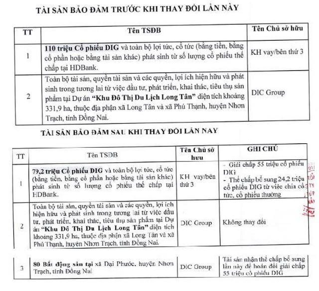 Thời điểm mới phát hành, tài sản đảm bảo của ba lô trái phiếu nói trên gồm 110 triệu cổ phiếu DIG và toàn bộ lợi tức, cổ tức phát sinh từ số lượng cổ phiếu thế chấp tại HDBank. Bên cạnh đó, tài sản đảm bảo còn gồm toàn bộ tài sản, quyền tài sản và các quyền, lợi ích hiện hữu và phát sinh trong tương lai từ việc đầu tư, phát triển, khai thác, tiêu thụ sản phẩm tại dự án Khu đô thị du lịch Long Tân quy mô 331,9 ha ở Nhơn Trạch, tỉnh Đồng Nai của DIC Corp.