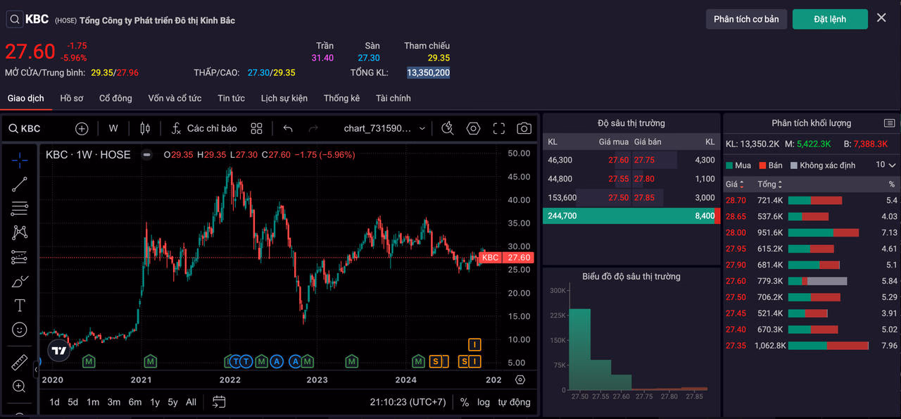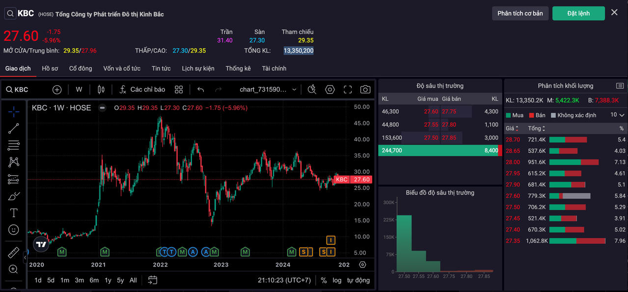Cần biết, sau khi ông Donald Trump tái đắc cử Tổng thống Mỹ, cổ phiếu KBC đã có nhịp tăng hơn 11% từ vùng 26.x lên 29.x trong chưa đầy nửa tháng. Mã này cũng có nhiều lần nỗ lực vượt mốc 29.600 đồng/cp để trở lại vùng giá 30.x hồi đầu năm song đều thất bại.