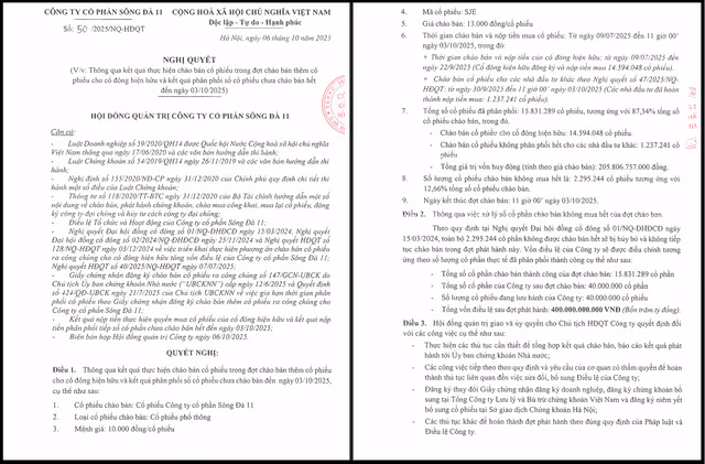Theo đó, kết thúc đợt chào bán ngày 3/10/2025, Sông Đà 11 đãphân phối thành công hơn 15,8 triệu cổ phiếu, chiếm 87,35% tổng số lượng cổ phiếuchào bán (hơn 18,1 triệu cổ phiếu), tổng giá trị vốn huy động được tính theogiá chào bán là hơn 205,8 tỷ đồng.