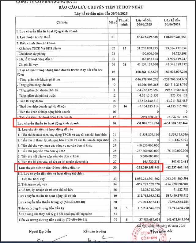 Bên cạnh kinh doanh đi lùi, trong nửa đầu năm 2025, Sông Đà11 còn ghi nhận thêm dòng tiền kinh doanh chính âm 51,9 tỷ đồng so với cùng kỳâm 434,3 tỷ đồng. Thêm nữa, cũng trong kỳ, dòng tiền đầu tư âm 238,1 tỷ đồng vàdòng tiền tài chính dương 212,7 tỷ đồng, chủ yếu tăng vay nợ để bù đắp dòng tiềnkinh doanh thâm hụt và phục vụ hoạt động đầu tư.