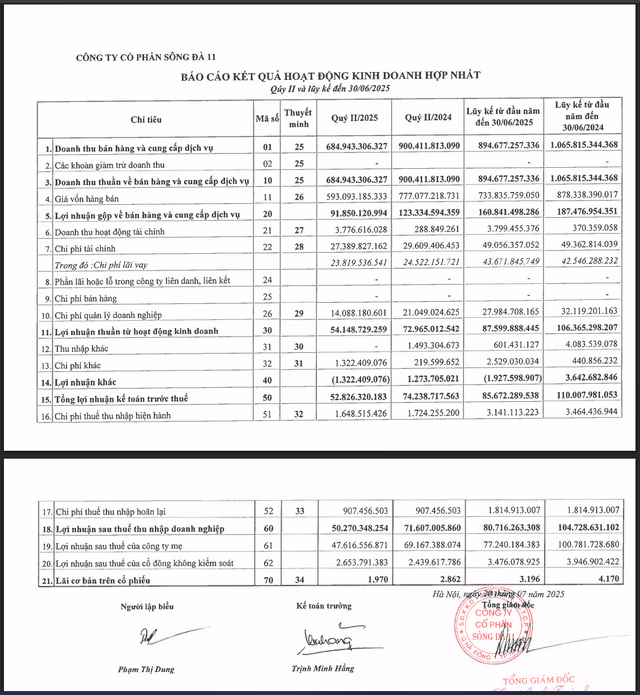 Lũy kế trong nửa đầu năm 2025, Sông Đà 11 ghi nhận doanh thuđạt 894,68 tỷ đồng, giảm 16,1% so với cùng kỳ, lợi nhuận sau thuế đạt 80,72 tỷđồng giảm 22,9% so với cùng kỳ năm trước.
