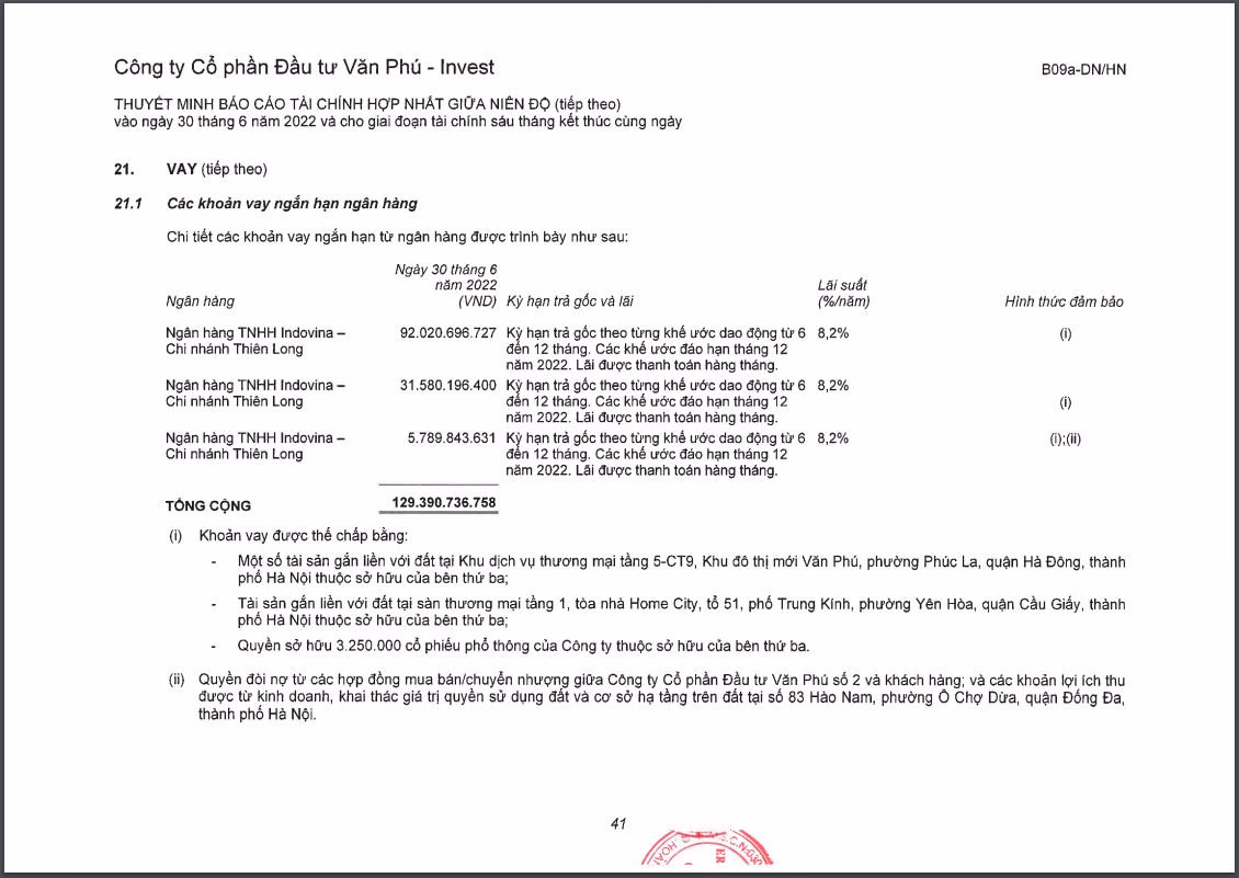 Chủ nợ lớn nhất của doanh nghiệp là ngân hàng Vietcombank với khoản vay trị giá gần 817 tỷ đồng, ngoài ra Văn Phú - Invest còn vay của Ngân hàng TNHH Indovina, VP Bank và MB Bank.